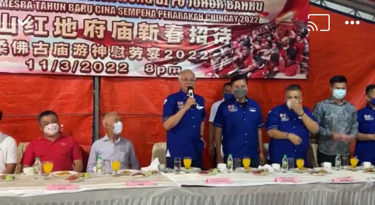 (新山11日讯) 柔佛州选投票日前夕,“BossKu”(我的老板)前首相拿督斯里纳吉出席柔佛古庙游神慰劳宴,并在会上公开为国阵拉票,呼吁选民票投国阵。 面子书今日流传一段视频显示,纳吉晚间出席新山红...