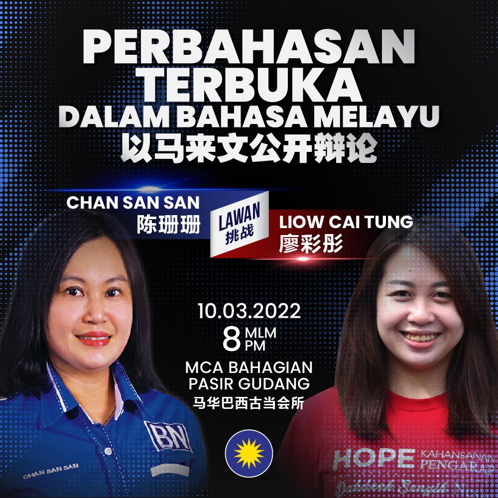 (新山8日讯) 国阵马华柔佛再也州议席候选人陈珊珊今晚向对手,希盟行动党柔佛再也州议席候选人廖彩彤发出辩论邀请,挑战以国语来进行辩论。 陈珊珊邀请廖彩彤在本月10日(周四),晚上8时,出席在马华巴西...