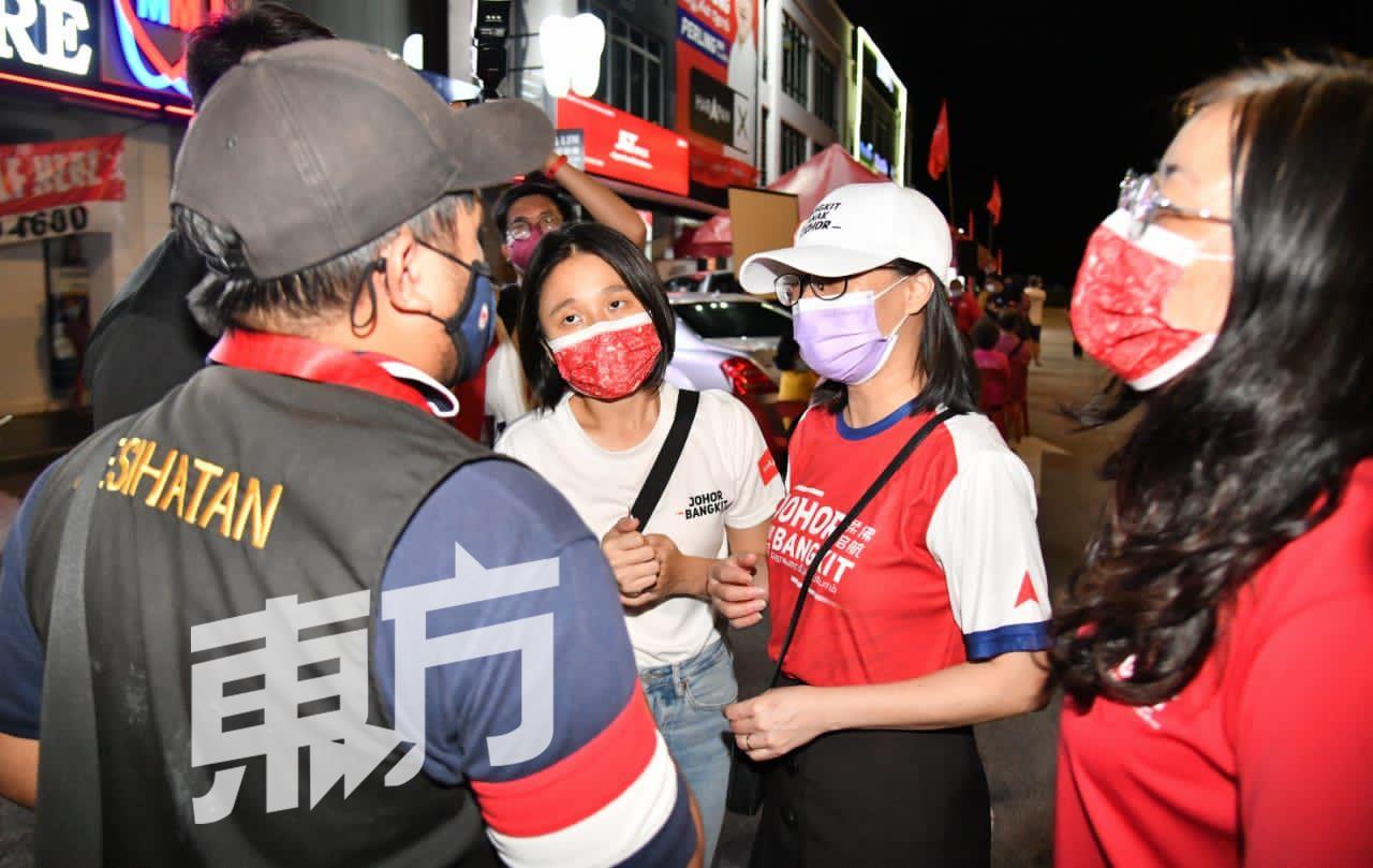 (新山4日讯)行动党今晚举行柏伶群众造势,因现场出席人数超过选委会规定的100人,遭卫生局官员“劝告”。 上述讲座今晚8时许,在新山顺和花园举行,出席者反应踊跃,除了坐在搭建的帐篷内,五脚基和马路旁...