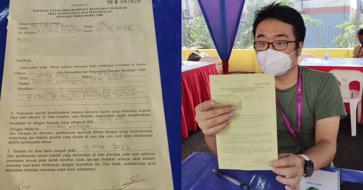 (新山26日讯)媒体在提名中心外采访因没有遵守安全距离,遭开出1000令吉罚单。 据了解,《星洲日报》记者黄建荣今日在拉庆州选区提名中心外采访时,被卫生局官员以没有遵守安全距离而被开出1000令吉罚...